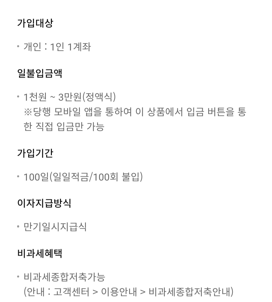 기본 금리는 2%로 매우 낮지만 입금할 때마다 우대금리가 적용되므로 최대 12%까지 받을 수 있습니다. 100일 이후 원금과 이자가 만기지급되는 방식입니다.