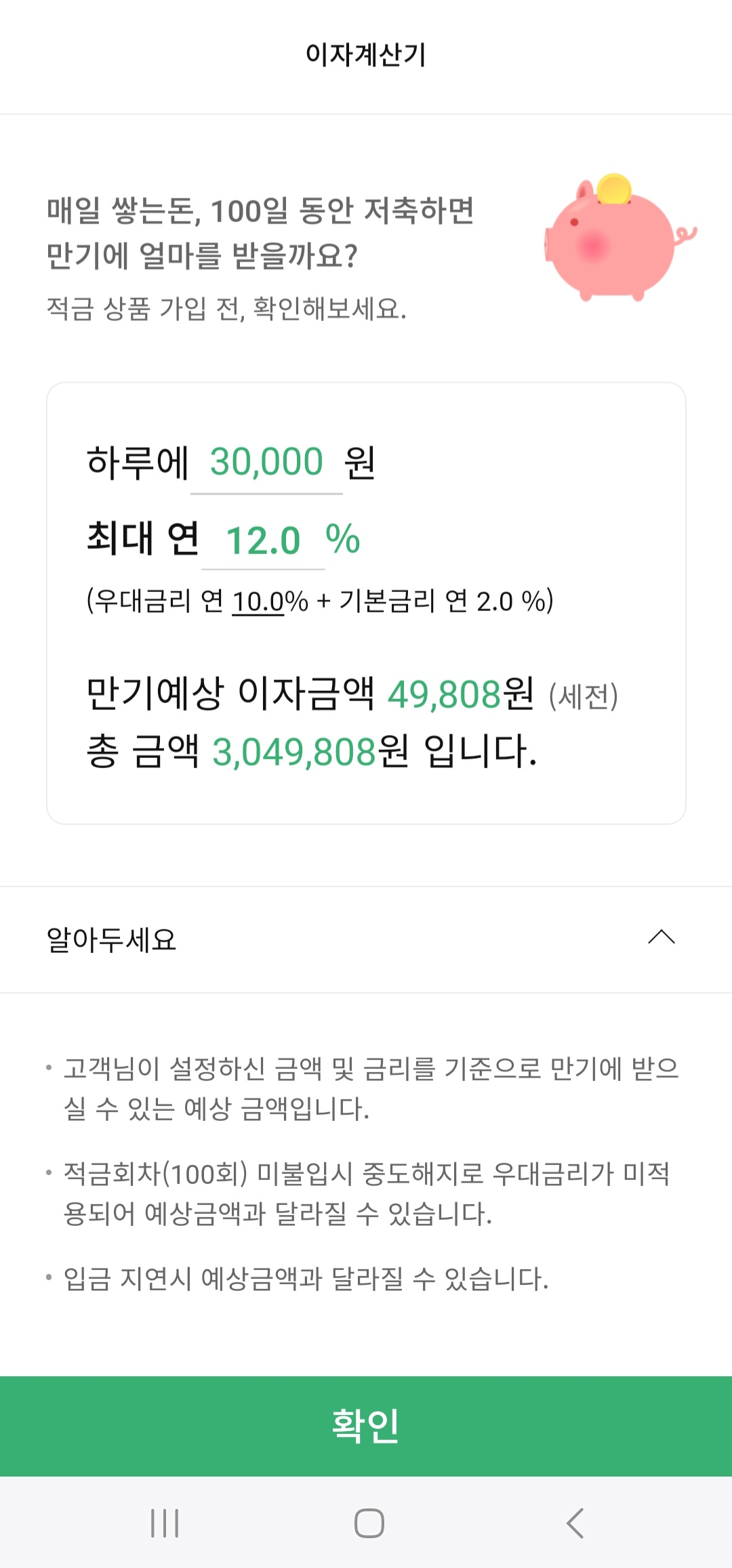 100일이라는 짧은 기간과 납입 한도의 제한이 있긴 하지만, 3만원씩 100일 동안 꾸준히 적금하면 꽤 쏠쏠한 이자를 받아볼 수 있습니다!