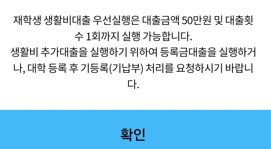 등록금도 냈겠다. 한국장학재단에서 생활비대출을 진행하려고 했습니다. 이미 생활비대출 우선실행은 진행한 상태였고 등록금도 냈으니 잔금 실행이 가능할 줄 알았는데 위와 같이 나오더라구요. 그래서 대학 등록 후 기등록 처리가 뭔지, 생활비 대출을 받으려면 어떻게 해야하는지 알아보겠습니다.