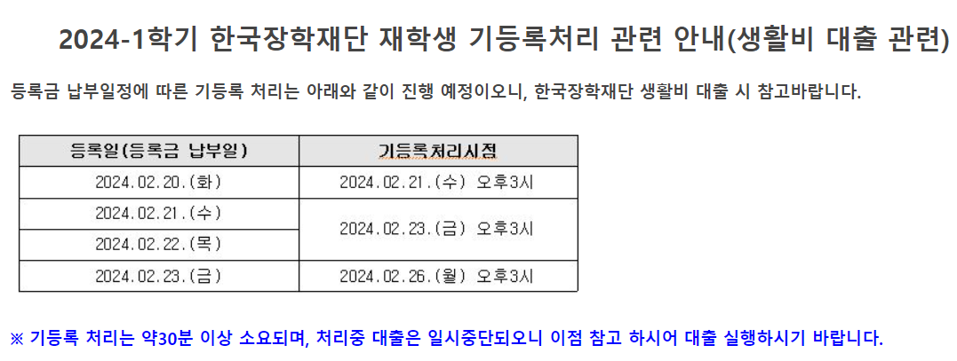 이건 신라대 기등록 처리 일정입니다. 기등록 처리 시점 이후에 생활비 대출이 가능합니다.