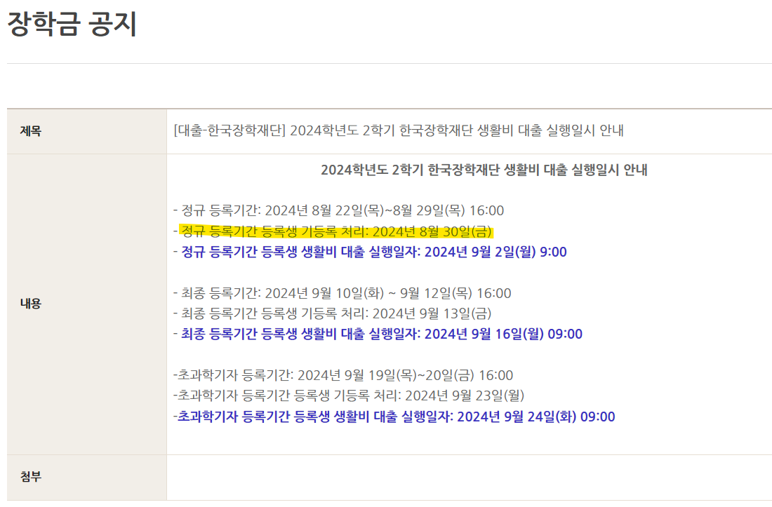 그래서 2024 OO대학교 한국장학재단 기등록, 혹은 생활비 대출 이런 식으로 검색하신다면 원하는 일정 정보를 찾으실 수 있을 것입니다. 혹은 직접 요청해야 하거나요.