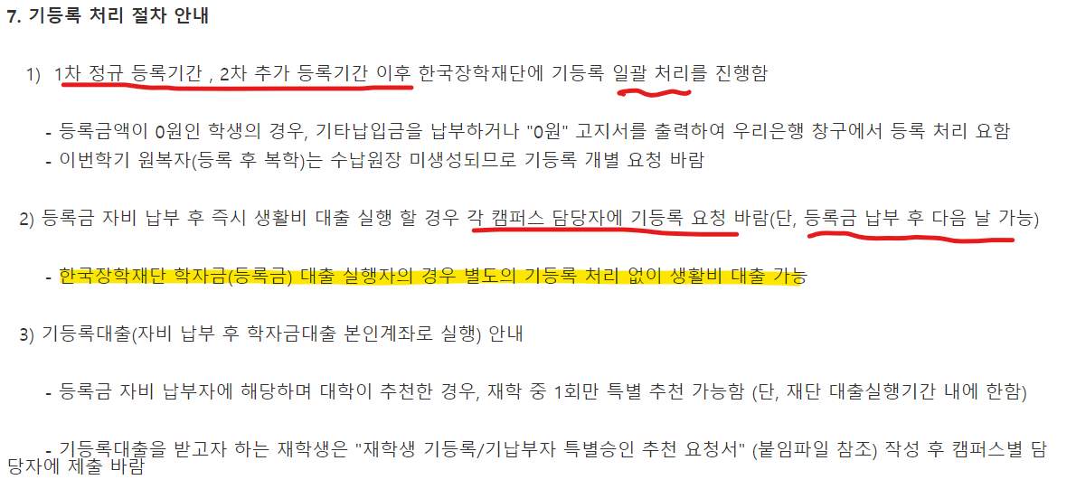 여기는 한국외대 기등록 처리 일정입니다. 1, 2차 등록기간 이후에 일괄 처리를 진행하고, 즉시 생활비 대출을 원한다면 캠퍼스 담당자에게 직접 문의해야 합니다. 말했듯 한국장학재단에서 학자금 대출을 받아 등록금을 납부했다면 바로 가능합니다.
