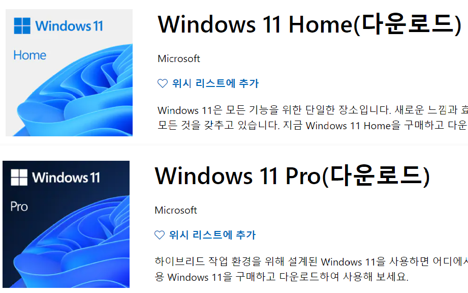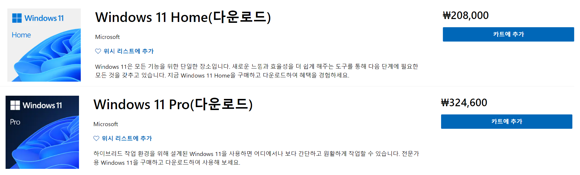 공식 마이크로소프트 홈페이지를 통해 확인하면 윈도우 11 홈은 208,000원, 프로 버전은 324,6000원으로 큰 가격 차이가 존재합니다. 더 좋아보인다고 Pro를 고르기에는 큰 가격 차이죠. 그럼 어떤 기능이 추가되어 있을까요?